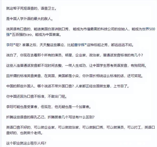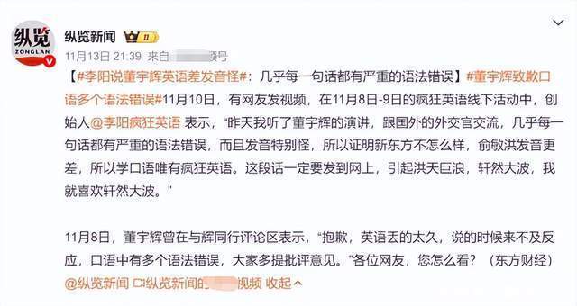 比如这次,在11月8日至9日的疯狂英语线下活动中,李阳竟然批评董宇辉和新东方。还被自己的学员录下来发到了网上。而他的言论让不少网友都表示了反对。李阳说:“我听董宇辉跟国外的外交官交流,几乎每一句话都有严重的语法错误,而且发音特别怪。”